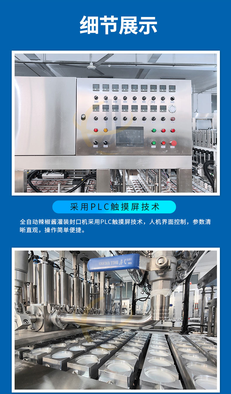 杯裝辣椒醬灌裝封口機適用于辣椒醬、黃豆醬、豆瓣醬、牛肉醬、沙拉醬等各種杯裝、盒裝等產品的生產。