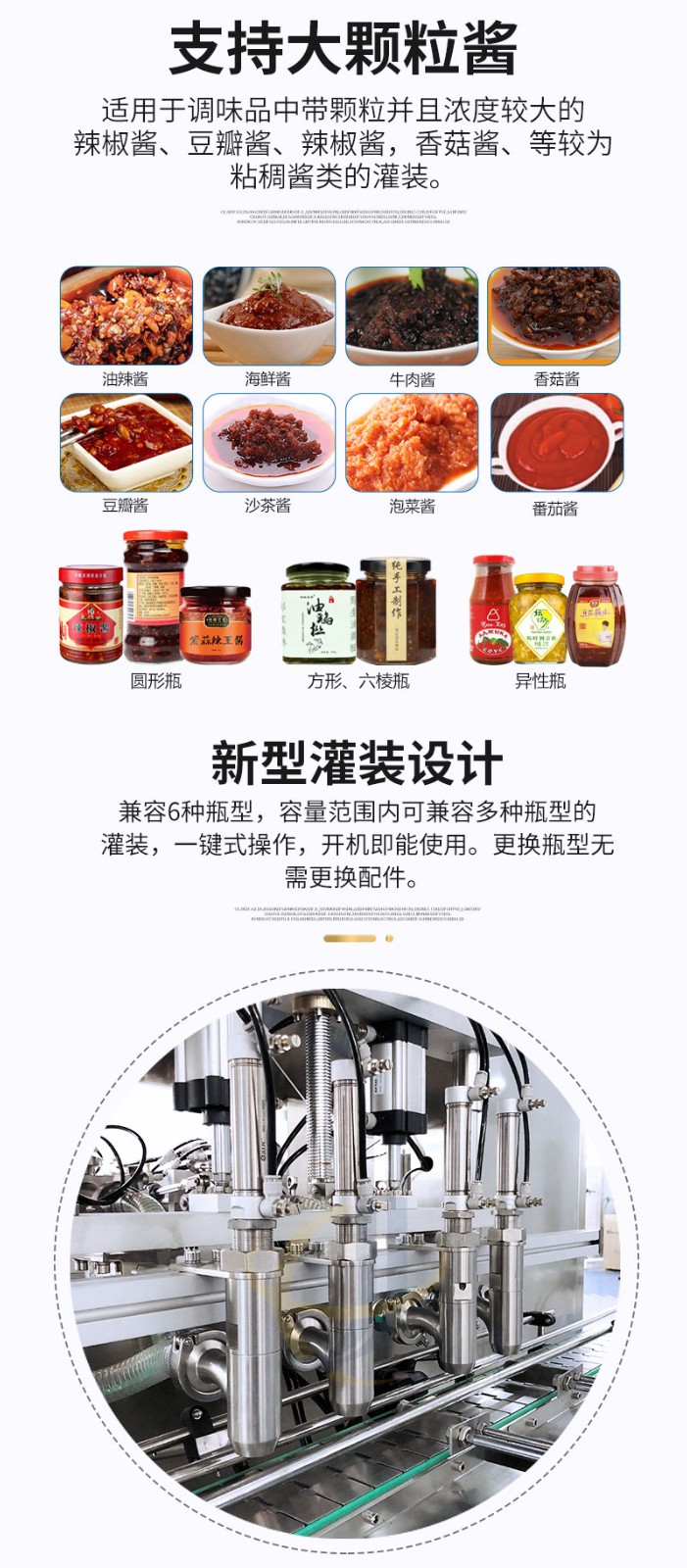 全自動(dòng)四頭辣椒醬灌裝機(jī)適合中小口徑三旋、四旋玻璃瓶調(diào)味醬的分裝,適合醬料、含顆粒黏稠物料的灌裝,物料接觸部分均采用