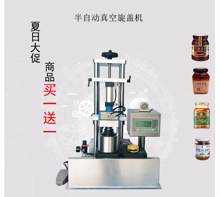 這款小型辣椒醬封口機主要用于食品包裝,采用標(biāo)準(zhǔn)馬口鐵爪式旋開蓋封口的玻璃瓶包裝??蓪崿F(xiàn)的功能是抽吸包裝容器內(nèi)的空氣使其達(dá)到設(shè)定的負(fù)壓值(即抽真空),然后旋緊蓋子。 為半自動機型,即人工進(jìn)出瓶,人工配蓋,其他過程自動。